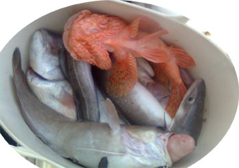 | Fotos parciales de una pesquera a bordo de LOS BLANCO , veteranos de la pesca al volantin en Torrevieja. A la izda brótola cabracho congrio y pargo. A la derecha junto a otros, 4 buenos pargos |