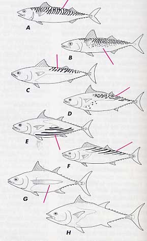 | Esquema muy didáctico de los Escómbridos de las aguas españolas tomado del estupendo libro de J.Corvera, Ana Sabatés y Antoni García : PECES DE MAR DE LA PENINSULA IBÉRICA |