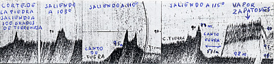 Imagen del planazo recorrido de E. a W . Arriba el fondo se mantiene casi uniformemente entre 216 y 220 m y está cubierto en su mayor parte de sedimentos. A la izda el abrupto canto de fuera. El de tierra también desciende bruscamente aunque de una manera algo escalonada |