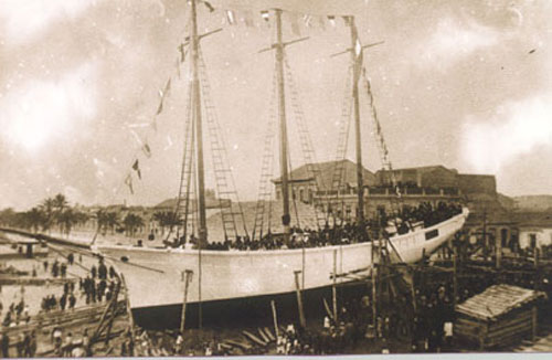 Botadura del Pascual Flores construido por Marí en 1918 en el astillero que existía junto al muelle Minguez