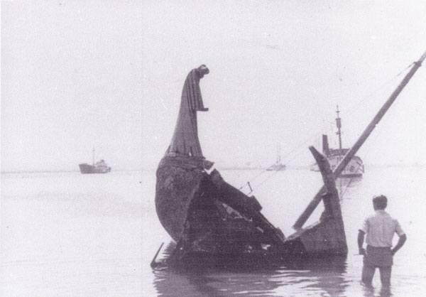 Curiosa imagen de este pecio que reproduce la silueta de un Cristo. El barco al que se conocía como El Pedro estaba hundido en el talud al cominenzo del dique de levante Año 1945 aprox.