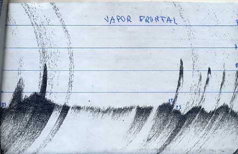 Ecograma de otro vapor hundido en 89 m. de sonda frente a la Isla Grosa . Lo descubriómi hermano Federicoa bordo del Chambel un Jueves Santo de 1989.En else hicieron así mismo pesqueras increíbles de pargos besugos y chernas. El pecio estáhundido en fondo rocosa con un desnivel acusado |