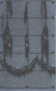 La imagen en la sonda gráfica que data de 1994 muestra una red encima del pecio, que si no se elude en el fondeo, puede ocasionar problemas, aparte de los muchos aparejos que se pierden . Ademas presenta una curiosa imagen del mismo (en el centro del ecograma de la derecha) tomada atravesando el barco hundido, pareciendo que el pecio flota. Es debido a que al abrirse en angulo la emisión de ecos estos se reflejan en el `pecio y en el piso del fondo adyacente. El ecograma de la derecha esta hecho a barco fondeado. Las manchas blanco azuladas son ocasionadas por pequeños besugos
