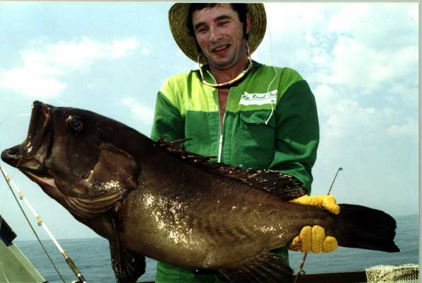 Nuestro mejor mero denton pesó 12,800 y fue capturado por Antonio Ruiz.Observese el color mas oscuroque la cherna situada debajo y la presencia de dos crestas óseas en el operculo, en vez de una de la cherna