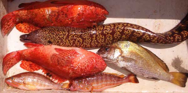 Dos gallinas o cabrachos de 1,5 y un kilo junto a una corva, morena y serranos Año 2004