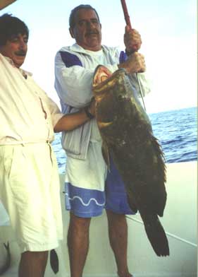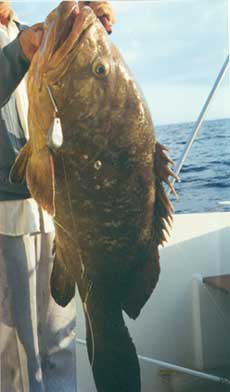 Mero de 20 kilos , récord del Club, pescado en 1993 a bordo del Mistral por mi hermano , utilizando una enorme boga viva En la báscula del Clubse puso una tabla para ayudar a pesarlo. Descontando tabla y cabo su peso exacto fue de 20 kg Arriba: En la foto de la derecha se aprecia un plomo y un aparejo colgando de la boca del enorme mero. Resulta que unos días antes había perdido, con un gran pescado, precisamente ese aparejo. Un quitavueltas deficiente ( o un despiste al cerrarlo) hizo que este hermoso animal se escapara en esa primera ocasión. |