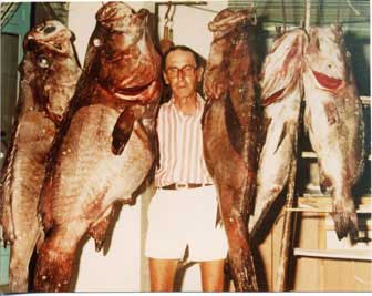 A la derecha con 5 chernas enormes, una de ellas de 93 kg pescadas en el Secaño, a donde iba con un pequeño barco de 8 metros y 45 CV tardando unas 5 horas en alcanzar el pesquero, con ayuda solo de tiempo de navegación, rumbo y sonda. Era verdaderamente un fuera de serie a pesar de su aspecto mas bien delgado y poco vigoroso |