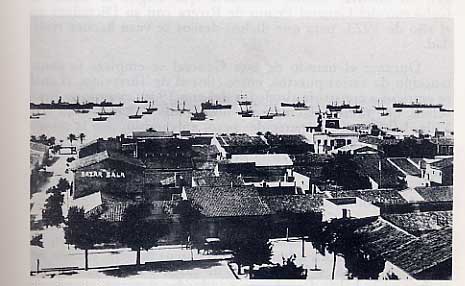 Profusión de barcos pesqueros y de carga. Bahia vista desde la torre de la Iglesia