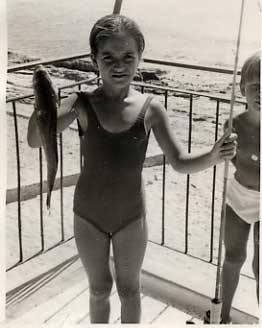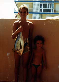 | En aquellos años se podían hacer buenas pesqueras hasta desde la puerta de la casa, en la playa de los Náufragos. Vea si no, estas dos fotos de aquellos años. Una buena dorada y un llobarro pescados por Rogel un buen pescador de Orihuela, empleando simplemente pata de pulpo. |