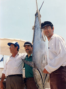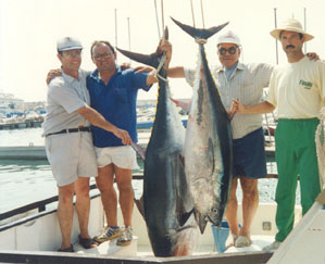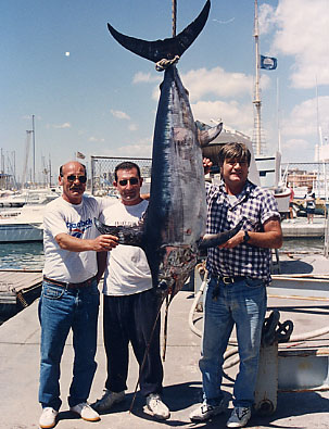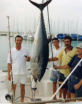 Para ver ampliadas las fotos de otras capturas haga click sobre las pequeñas imágenes Al año siguiente, en 1995, numerosos barcos profeionales de pequeñas esloras procedentes de Aguilas, Mazarrón , Denia etc se concentraron en Torrevieja consiguiendo capturas importantes de atun durante los meses de invierno y primavera, pescándolos a 24 millas de Torrevieja cerca de los llamados “Candeleros” Los barcos deportivos de este Club lográbamos también ese año unos 30 grandes atunes. Es entonces cuando José de la "Ilusión" pesca un gran atún aún record en Torrevieja, de 340 kilos.