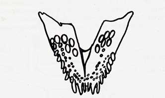 ![]() Dentadura de pargos y hurtas. Como se vé tienen dientes caniniformes en su parte delantera pero molares en su parte posterior |