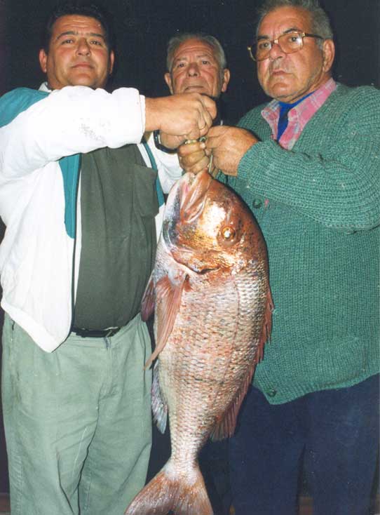 Pagrus auriga o urta hembra de 2,6 kg y 50 cm aprox capturada por J.M. Medina. Lo especial de este ejemplar, es que (aún con la "forma auriga") presenta ya los puntos azules que caracterizan a a la forma Sparus caeruleostictus o pargo de puntos azules , lo que podría apoyar la teoría de que se trata de una misma especie que va evoolucionando con su crecimiento y al tornarse machos lo que eran inicialmente hembras |