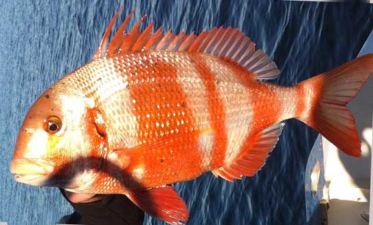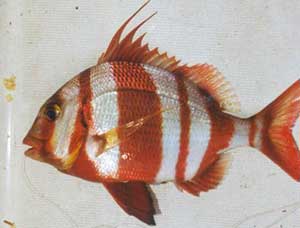 Otro ejemplar de hurta de 5 kg probablemente hembra en la que ase ven las bandas rojas aunque algo difuminadas. Conserva la 3ª a la 5ª espina dorsal algo mas largas, pero no tanto como las más jovenes. También se ven algunos puntos azules en cabeza y dorso