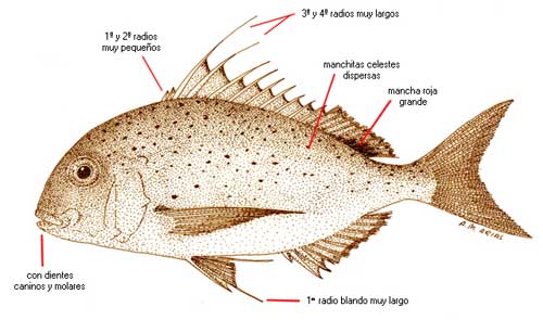 5. Pagrus auriga también tiene puntos negros. Es posible que sean también azules, o en la gama de los azules. Pero sí están descritos en la especie.