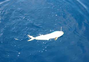 Es corriente que otras lampugas acompañen a esta que va prendida en el anzuelo, siendo esta circunstancia aprovechada po los demas de a bordo que les largarán a las que se acercan unas pequeñas sardinas enganchadas en sendos aparejos. Si vienen un par de ellas al menos, la picada está asegurada.