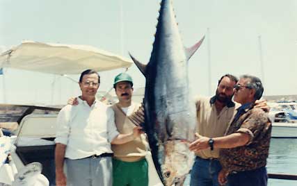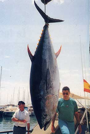Aquel lejano día de primavera, un amigo profesional, dedicado a la pesca del pez espada, había detectado la presencia de atunes cerca de la costa de Torrevieja. Con esta valiosa información, al día siguiente, antes de que amaneciera, estábamos ya en la zona indicada. De vez en cuando y con un intervalo de unos 50 metros tirábamos una alacha haciendo rastro hasta llegar al sitio señalado en el Plotter según las coordenadas que nos habían indicado. Ibamos atentos mirando hacia todas las direcciones pero especialmente a popa, por si se veía esa señal característica que indica la presencia del atún cerca de la superficie. Consiste en una especie de borbotón en la cara del agua, provocado por la poderosa aleta caudal del atún cuando atrapa una alacha cerca de la superficie. Al llegar al punto elegido, dejamos el barco a la deriva. Pusimos en una de las cañas una alacha y en el terminal de la otra, encarnamos del lomo, junto a la cabeza, una salpa viva de unos 300 gr. que dejamos ir mas al fondo con ayuda de un plomo. Con aquellas (y también con lisas) hemos conseguido varios grandes atunes. Brumeamos arrojando trozos de alacha y de vez en cuando alachas enteras. A los pocos minutos sonó en nuestra sonda el pitido intermitente de la alarma del pescado. !Había un atún bajo el barco en 20 m. de agua! Emoción a bordo y un rápido reparto de cometidos para que cada uno sepa lo que hacer en el momento adecuado. Seguramente nos había seguido mientras navegábamos. Hubo entonces una espera tensa, pues sabíamos que en cualquier momento podía producirse la picada. Reforzamos el brumeo para hacer subir el atún; procuramos colocar uno de los cebos al nivel que nos señala la sonda, pero el tiempo pasaba y ni se veía el atún en superficie ni quería picar. Sabíamos que estaba allí pues de vez en cuando saltaba la alarma. Alguien a bordo empezó a dudar y pensando que las señales de la sonda seriían de otra clase de pescado. Pero los demás sabíamos que era“él” y que seguía allí