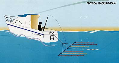 En la anterior página he intentado explicar como provocar la picada del atún En ésta hablaré de una técnica que es la utilizada en el Japón, y que según el gran escritor de temas de pesca deportiva Fernández Román (1), es de una eficacia extraordinaria. Se le llama allá Maguro kaki. Mi experiencia con este excitador es muy corta, dado que lo usamos solamente en unas cuantas ocasiones hace años. Posteriormente apenas he salido en busca del gigante dada su escasez y su lejanía de la costa de Alicante.Con todo, creo que vale la pena dar a conocer esta técnica, pues estoy convencido de su prometedora eficacia.