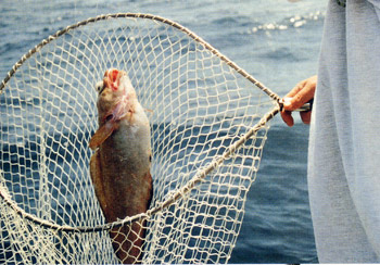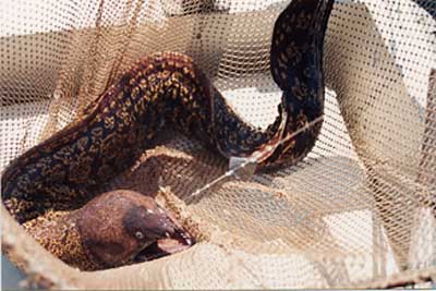 Yo clavé una buena pieza que me divirtió inicialmente con su bravura. Luego comprobé que se comportaba como un congrio, dejádose subir pesadamente para de vez en cuando irse con fuerza hacia el fondo. Resultó ser una preciosa morena de 2 kilos que desde el fondo del salabre nos miraba con sus ojos iracundos y su boca amenazadora. -!Este es muy gordo! -aseguró. Inicialmente lo trató con dureza para impedir que el animal se refugiase dentro del pecio. Luego lo vi trabajarlo con calma y maestría cediendo a intervalos metros de línea cuando el bicho se iba inconteniblemente hacia el fondo. Poco a poco lo fue elevando, sin prisas pero continuadamente Sebastián y yo retiramos rápidamentre nuestras líneas para no estorbar la faena y luego nos pusimos a su lado, uno con el salabre y yo con el bichero, por si se trataba de un gran congrio. Al poco lo vimos subir. Nos quedamos electrizados. Una gran cherna se debatía aún furiosa del extremo del sedal mostrando una gran boca abierta. Sebastián intentó meterla en el salabre, pero al ver yo su tamaño, con un decidido tirón la enganché con el bichero. Una gran alegría nos colmó a todos. Antonio, aunque veterano en estas lides, estaba que no cabía en sí de gozo.