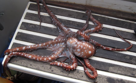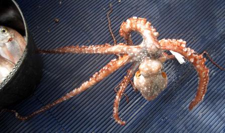 | El pulpo de patas largas o pulpón pertenece al género de los octopus como el pulpo o octopus vulgaris . Se diferencia de él, por sus larguísimas patas y por por la presencia en su cuerpo y patas de color rojizo, de manchitas blancas fosforescentes . Tiene doble fila de ventosas como el octopus vulgaris. En la literatura consultada se señala que esta variedad de pulpo tiene un manto o cuerpo de unos 13 a 15 cm de talla media , y un peso medio de 400 gr. Vea entre otras (http://doris.ffessm.fr/fiche2.asp?fiche_numero=848) y Wikipedia Nuestro ejemplar pesó 880 gr. y midió 16 cm de manto (medido como es preceptivo, desde la punta de la cabeza hasta los ojos) siendo su talla total de 123 cm. lo que quiere decir que es de los ejemplares mas grandes controlados . Ver mas bajo, detalle de su medida. Este era un ejemplar con gonadas de macho. Me llamó la atención, con relación al octopus vulgaris, que su embudo propulsor era muy largo y sobresaliente del manto y que éste estaba tabicado en su parte posterior . Vive en aguas cálidas del Mediterráneo, Mar Rojo, y en las aguas costeras atlánticas de Africa. Es mucho mas raro que el pulpo u octopus vulgaris y en mis mas de 70 años de pescador, es la primera vez que lo he visto. Lo mismo le ocurre al veterano buceador (y ahora pescador sobre barco) Jaime Martínez, que es el que lo lo pescó, a bordo del GINTONIC, con un volantín, utilizando de cebo un cangrejo ermitaño. El pulpón tiene hábitos nocturnos y vive en fondos rocosos y de posidonias, desde aguas someras hasta una profundidad de 40 m. Nosotros los pescamos en 44 m. de sonda frente al Pilar de la Horadada (Alicante). Vea otras fotos del mismo ejemplar |