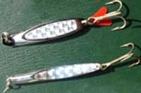 Su método consiste en dejar la cucharilla o jig hasta casi el fondo (jigging) o lanzarla unos metros dejando que se hunda un poco (spinning). Seguidamente da un par de tirones muy fuertes y seguidos, levantando con brusquedad la puntera de la caña, dando a continuación una o dos vueltas a la manivela del carrete, repitiendo los tirones y cobrando alternativamente línea hasta que aflore el señuelo. La finalidad es imitar la brusca huida de un pececillo a la vista de su depredador o llamar la atención del mismo al percibir éste las vibraciones del señuelo al agitarse, o al ver los destellos plateados que produce la pulida superficie del mismo. A mi lado estaba un veterano pescador profesional, Rafael “el del Meteoro”, ahora apasionado por la pesca deportiva. Hace unos 45 años fue uno de mis maestros en la pesca sobre barco y del cual aprendí “señas” –enfilaciones- de pesqueros que aún conservo y pesco.