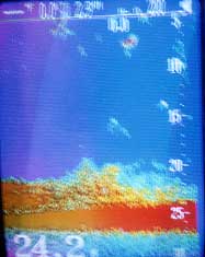 La presencia de seriolas la detectamos por las pequeñas marcas que dejan en la sonda, del todo semejantes a las que señalan la presencia de jurelas. ( Véase la significativa imagen) |
