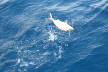 La primera vez que salí a esta interesante clase de pesca, fui invitado a bordo del “Esther” por Jeromo, un verdadero especialista en esta pesquera Fue realmente sorprendente ver la facilidad que posee de engañar a las seriolas con su artificial. Aún no habíamos preparado el resto de los tripulantes nuestras cañas y ya él batallaba con lo que fue una preciosa seriola. Me puse a su lado para observar su técnica y hacer unas fotos.