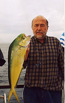 La lampuga, dorado, delfín o mahi-mahi es muy conocida por el pescador deportivo por lo que no me entretendré en su descripción. Solo quiero señalar algunos aspectos interesantes o menos conocidos de su corta vida. Es llamada en la región valenciana llampuga, aludiendo a su velocidad ( de llampo: rayo o relámpago). . Su color verde azulado en el lomo, se torna amarillo oro con incrustaciones de lapislázuli en el cuerpo, para pasar a un desvahído azul a las pocas horas de su muerte.