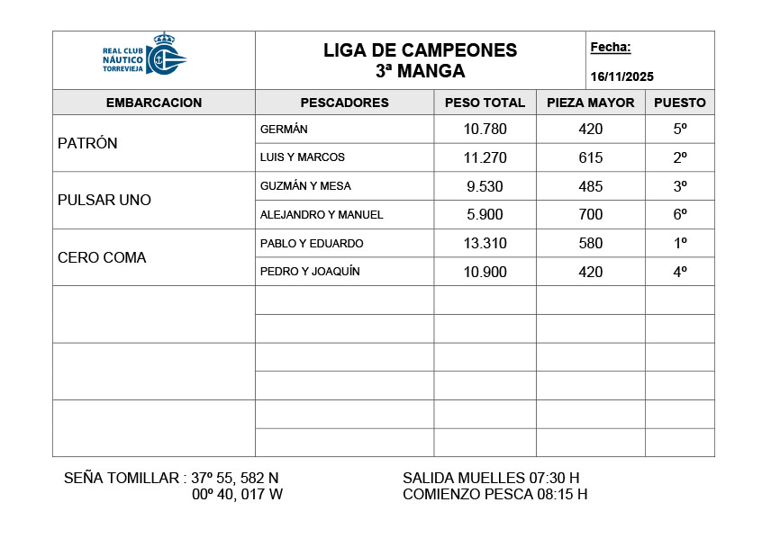 Foto procedente de la web del RCNT) El domingo dia 16 de Noviembre tuvo lugar la Tercera Manga de la Liga de Campeones. El tiempo fué muy bueno y la competición en sus primeras dos horas y media tuvo lugar en el llamado Tomillar, a unas pocas millas del puerto de Torrevieja, terminándose la competicion en un conocido pesquero cercano, frente a la Zenia, entre 24 y 27 m, de sonda..