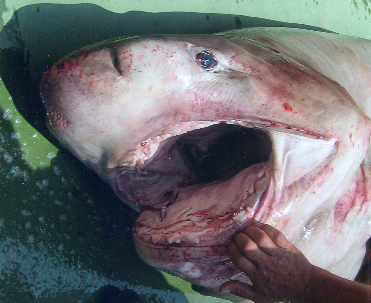 Están asombrados. Es distinto a todos los tiburones que conocen marrajos o tintoreras comunes en el Mediterráneo. Posteriormente Félix averigua que se trata de una cañabota, un tiburón de profundidad, pariente próximo del boquidulce. Tiene los ojos verdes, una única aleta dorsal muy cerca de la caudal, y unos dientes en la mandíbula inferior característicos en forma de peineta. Tiene además 6 hendiduras branquiales en vez de las 5 habituales en las demás especies de tiburones.