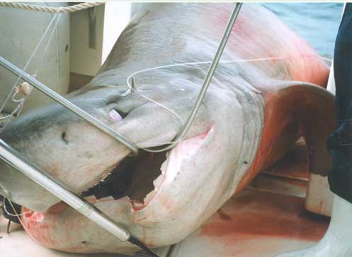 ¡Tranquilos, ya está!- dice Eduardo. El animal, cansado, permanece ahora inerte junto a la plataforma de baño. Aunando sus esfuerzos y aprovechando las cabezadas suaves que la mar imprime al barco, poco a poco lo deslizan a través de la portezuela, a la cubierta del barco. Eso si atentos a la enorme boca abierta y a los coletazos de su enorme cola capaz de destrozar una pierna puesta a su alcance.